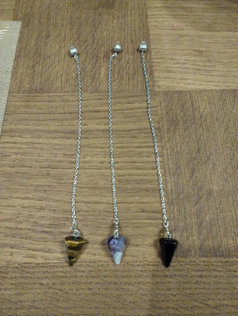 Este conjunto com 3 pêndulos (Ametista, Olho-de-Tigre e Ônix) é ideal para práticas de radiestesia, reiki e adivinhação espiritual.