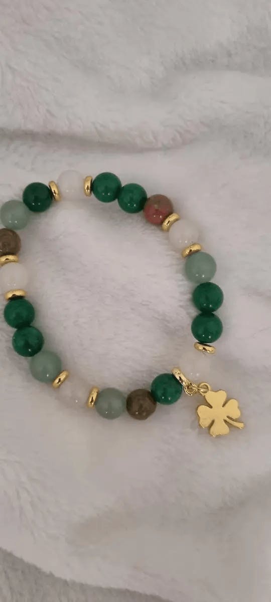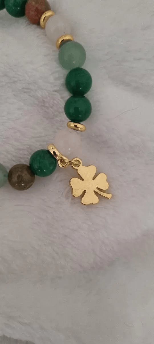 🌙 Feita à mão com pedras naturais e detalhe em trevo